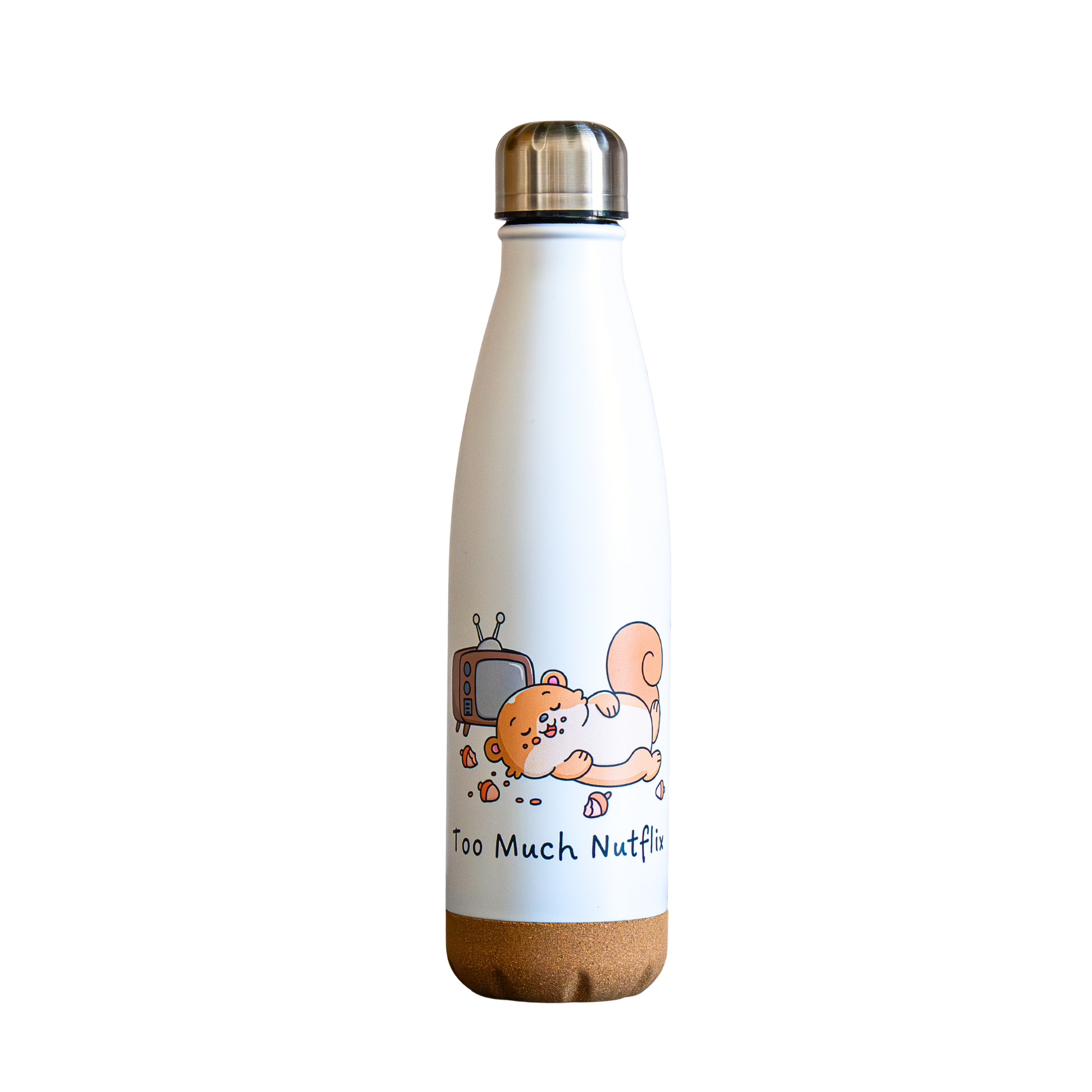 Tu es fan de Netflix? Exprime-toi avec cette gourde illustrée d’un petit écureuil trop gourmand et du jeu de mot "Too much Nutflix". Elle t'accompagnera partout avec son design fun et sa performance isotherme.