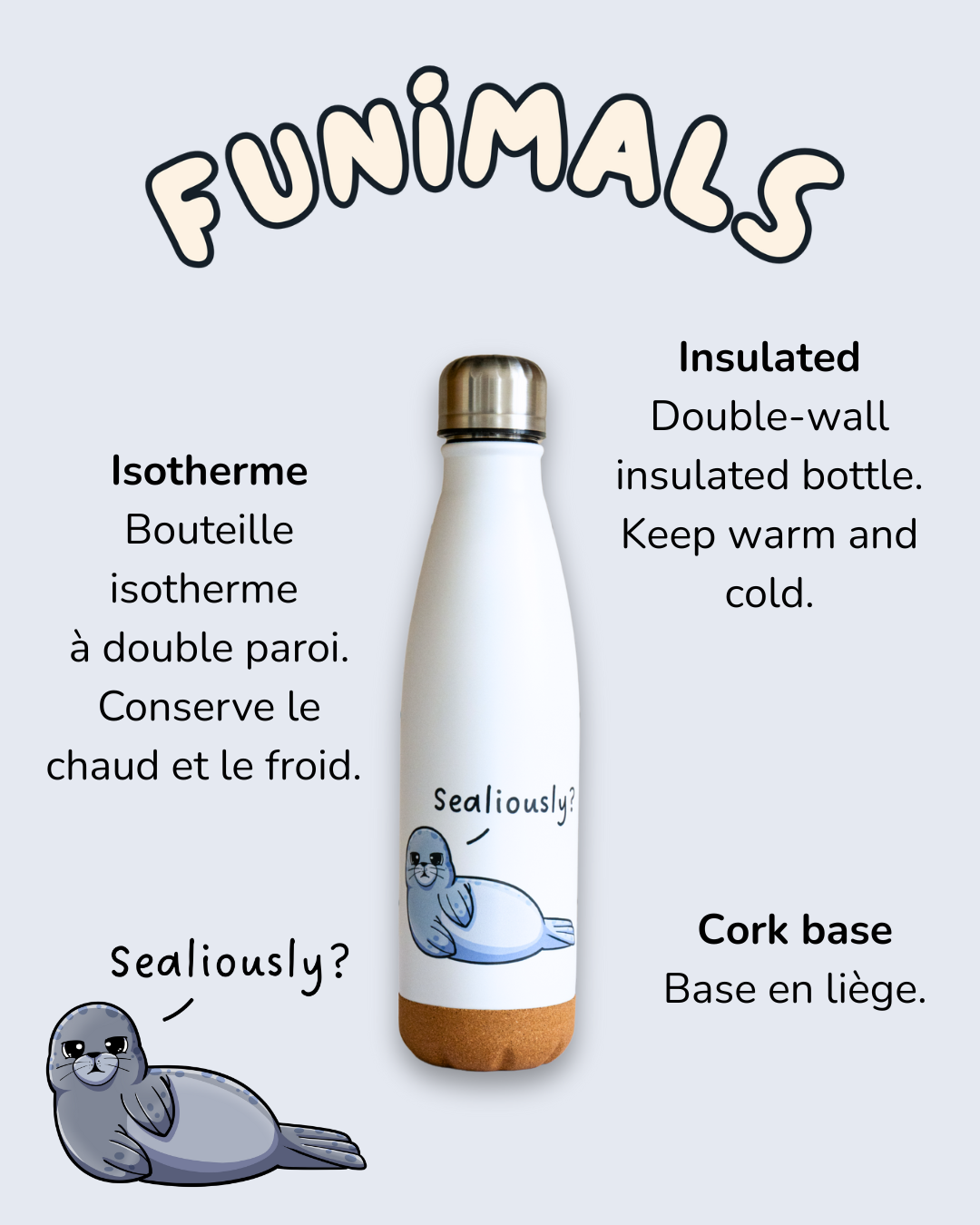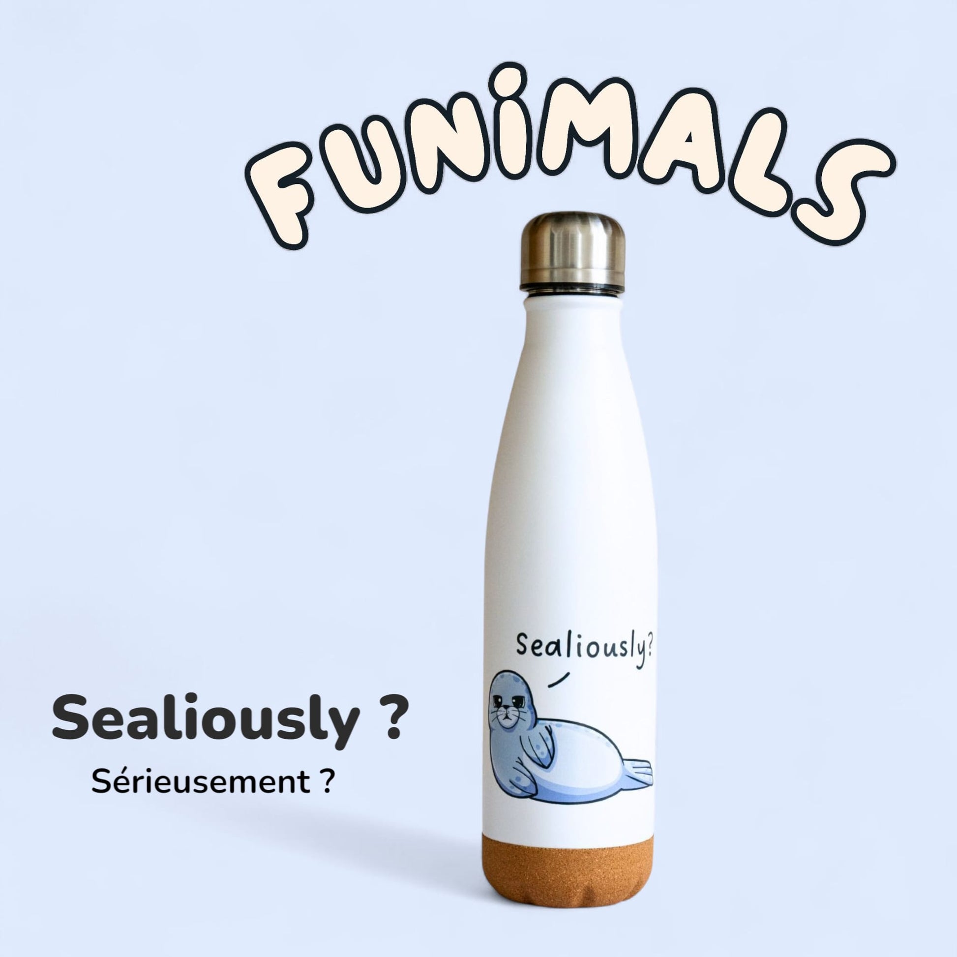 Un phoque mignon, un message ironique... et une bouteille qui garde ton style (et tes boissons) au frais ou au chaud !